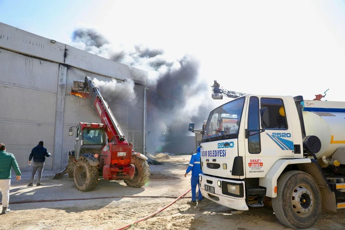 Küçük Sanayi Sitesi içerisinde yer alan depoda çıkan yangına itfaiye ekipleri ve Didim Belediyesi ekipleri kısa sürede müdahale etti. Alevlerin çevredeki iş yerlerine sıçramaması için yoğun çalışma yürütülürken bölgede güvenlik önlemleri artırıldı.