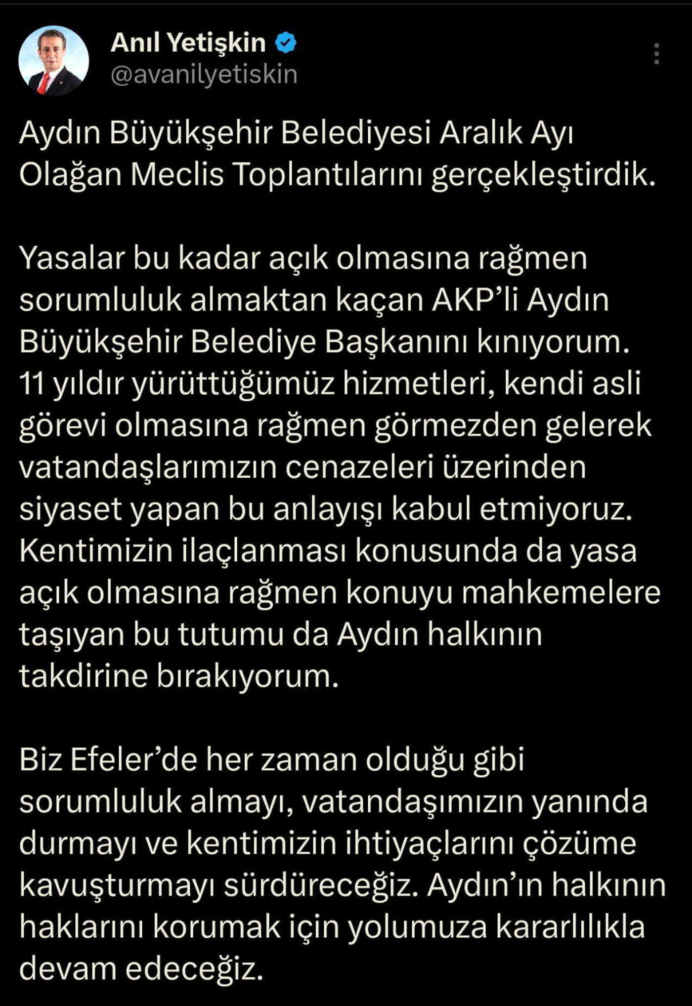 Yasalar bu kadar açık olmasına rağmen sorumluluk almaktan kaçan AKP’li Aydın Büyükşehir Belediye Başkanını kınıyorum. 11 yıldır yürüttüğümüz hizmetleri, kendi asli görevi olmasına rağmen görmezden gelerek vatandaşlarımızın cenazeleri üzerinden siyaset yapan bu anlayışı kabul etmiyoruz.