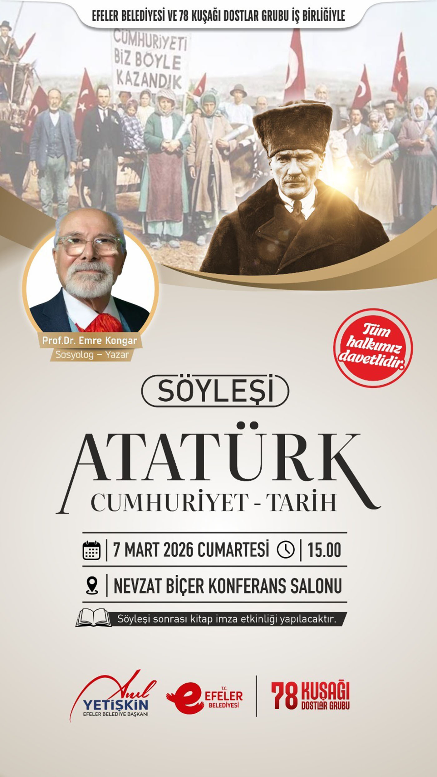 Sosyolog ve yazar Prof. Dr. Reşit Emre Kongar’ın konuşmacı olarak katılacağı söyleşide, “Atatürk-Cumhuriyet-Tarih” başlığı altında Türkiye’nin yakın tarihi, toplumsal dönüşümü ve Cumhuriyet bilinci vatandaşlarla buluşturulacak.