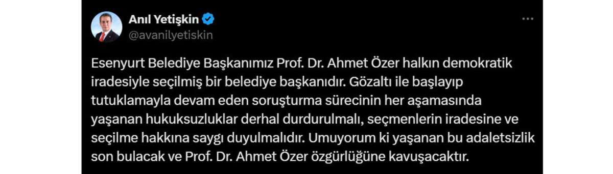 Efeler Belediye Başkanı Anıl Yetişkin, Esenyurt Belediye Başkanı Prof. Dr. Ahmet Özer'in tutuklanması üzerine, sosyal medya hesabından önemli bir açıklama yaparak dayanışma mesajı verdi.