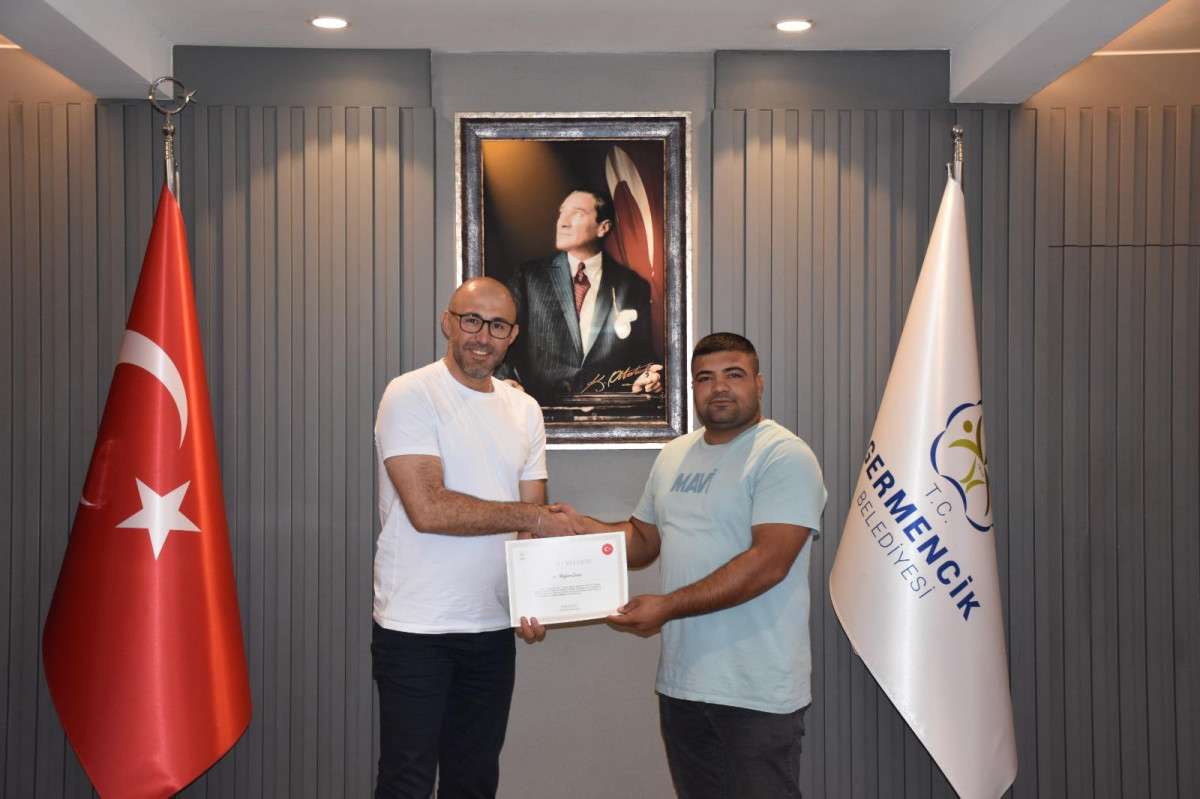 Germencik Belediye Başkanı Burak Zencirci geçtiğimiz günlerde Selçuk'tan başlayıp Pamucak ve ardından da Kuşadası'na kadar yayılan orman yangınında söndürme çalışmalarına katılan Germencik Belediyesi personellerine üstün başarı ve özverilerinden dolayı başarı belgesi takdim etti. Yangın söndürme çalışmalarında büyük bir emek ve fedakarlıkla çalışan belediye personelleri Mazlum Çavaş ve Ali Şekerli'ye başarı belgesinin yanı sıra gram altın da hediye eden Başkan Zencirci gurur ve mutluluk duyduğunu ifade ederek personeline teşekkür etti.