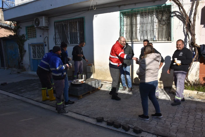 Başkan Zencirci soğuk havaya rağmen özveriyle çalışan belediye ekiplerini ziyaret ederek işçilere çay ikram etti. Sabah saatlerinde İstasyon Mahallesinde devam eden yol yapım çalışmasından bir işçinin paylaşımını gördüğünü ifade eden Başkan Zencirci termoslarla çay götürüp işçilere ikram etti.