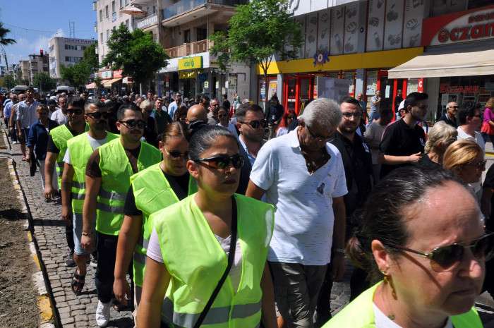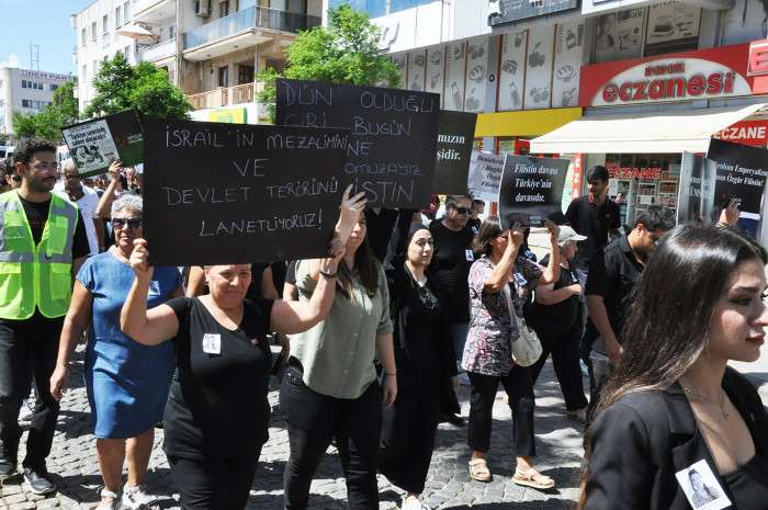 Didim İlçe Başkanlığı önünde toplanan partililerde kortej halinde ellerinde İsraili kınayan pankart ve Dövizlerle Cenaze Namazının kılınacağı Didim Merkez camiine sessiz yürüyüşle gittiler.