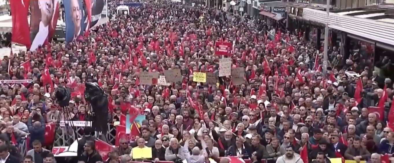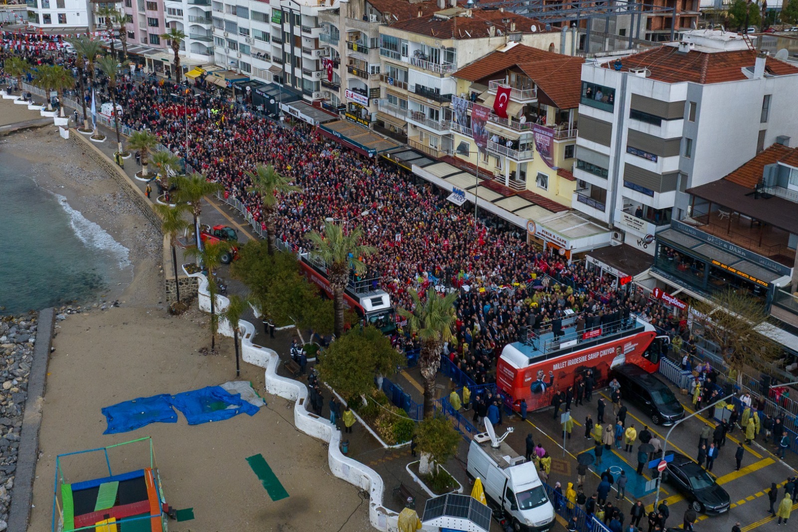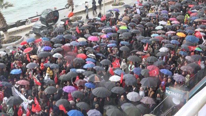 CHP Lideri Özel, Kuşadası’nda vatandaşlara seslendi. Yağmurlu havaya aldırış etmeden demokrasi ve adalet için alana gelen binlerce kişi, ‘hak, hukuk ve adalet’ sloganlarıyla meydanı inletti.