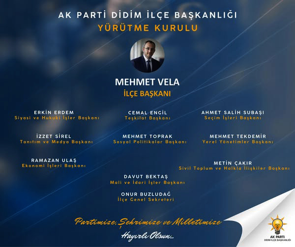 Başkan Mehmet Vela; “Millet sevdasıyla, hizmet aşkıyla, Liderimiz Sayın Recep Tayyip Erdoğan’ın izinde… Didim için gece gündüz demeden çalışacak Yürütme Kurulumuz ile yeni bir döneme güçlü adımlarla başlıyoruz. Birlikte daha güçlü, Birlikte daha kararlı,Birlikte Türkiye Yüzyılı’na! Durmak yok, yola devam” Dedi