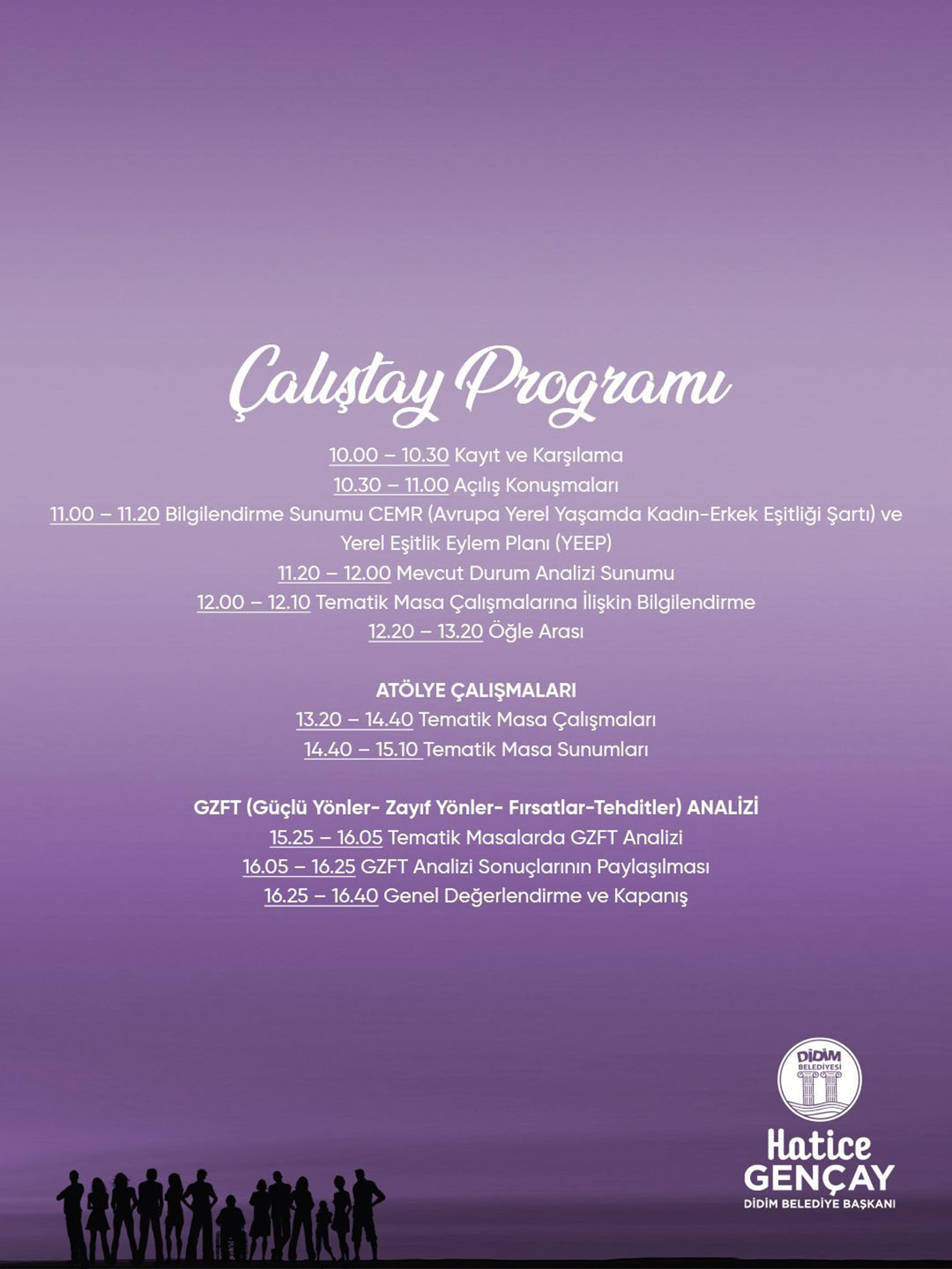 Ortak akıl ve geniş katılımla şekillenmesini önemsenen çalıştayda ortaya çıkacak görüş ve öneriler doğrultusunda, Didim’de eşitlikçi politikaların hayata geçirilmesi amaçlanıyor.