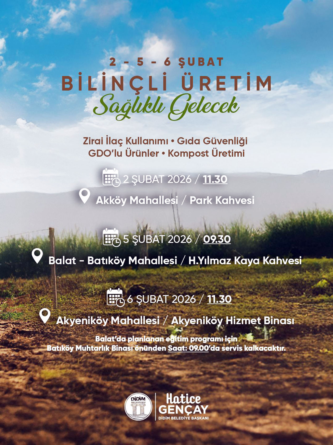 Didim’de yerel üreticiler ve çiftçilere yönelik bilinçli üretimi teşvik etmek amacıyla Didim Belediyesi eğitim programları düzenleyecek. “Bilinçli Üretim, Sağlıklı Gelecek” başlığıyla gerçekleştirilecek programlarda, zirai ilaç kullanımı, gıda güvenliği, GDO’lu ürünler ve kompost üretimi konularında üreticilere bilgilendirme yapılacak.