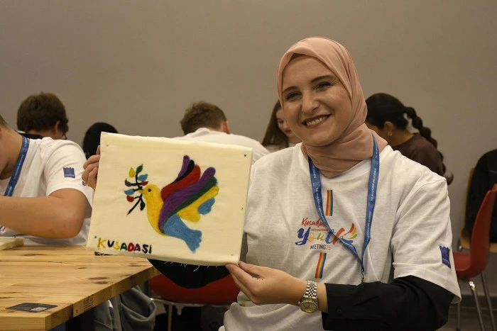 Gençlik Toplantısı’nın ikinci gün programı hakkında bilgi veren Kuşadası Belediyesi Dış İlişkiler Proje Yöneticisi Burcu Kanbal, “Dün muazzam bir açılış gerçekleştirdik. Bugün ise daha geleneksel ögelerle katılımcıları buluşturmak istedik. Keçe atölyemizde Kuşadası’nı simgeleyen güvercin motifini işliyoruz. Aynı zamanda öğrenciler, bu el emeği çalışmalarını kendi ülkelerine ve şehirlerine hatıra olarak götürebilecekler. Hepsi çok keyif alıyor, bu da bizler için çok kıymetli” dedi.
