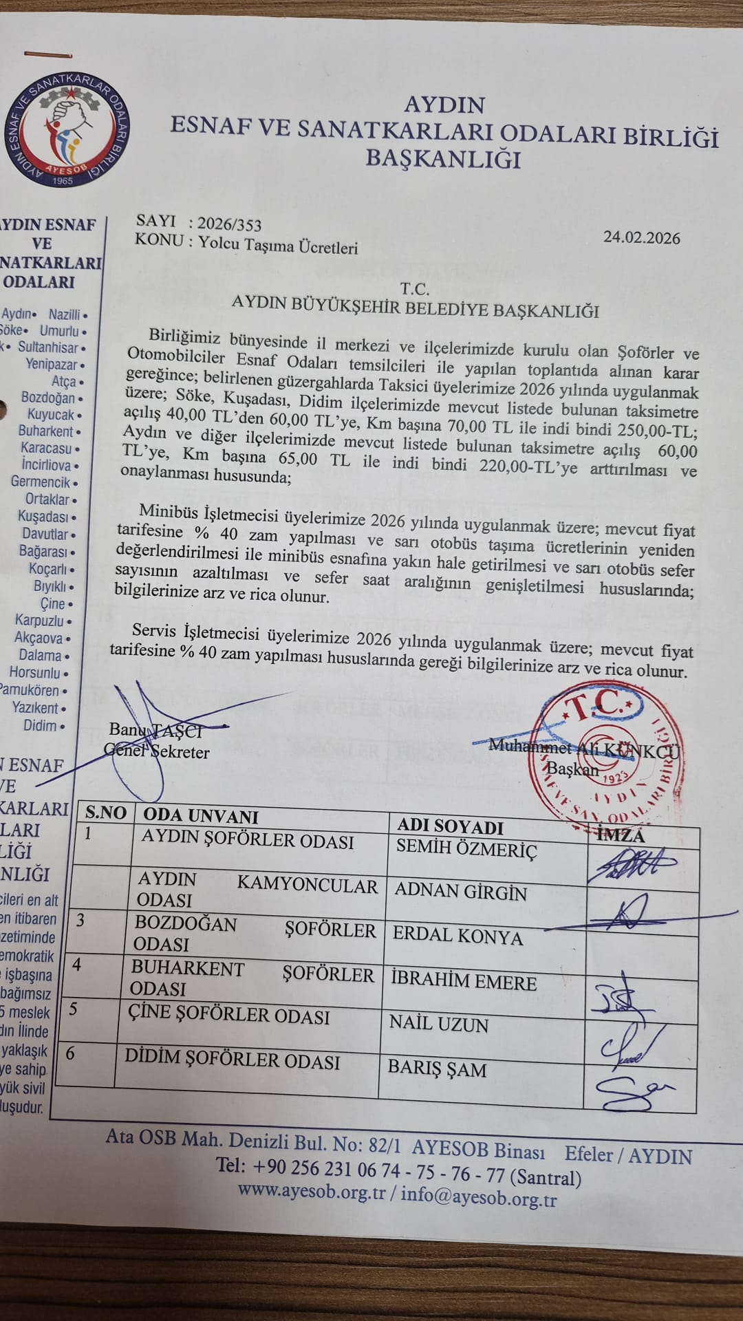 AYESOB Başkanı Künkcü ayrıca zam talebinin altında kendisi de dahil olmak üzere komisyondaki şoförler odası başkanlarının imzasının bulunduğunu sözlerine ekledi.