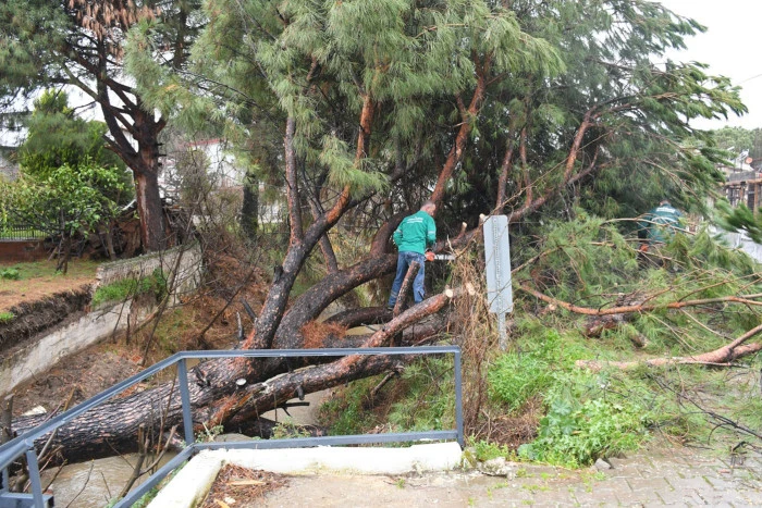 Güzelçamlı Mahallesi Ünal Özgödek Caddesi üzerinde bulunan dere yatağında, günlerdir aralıksız devam eden yağışlar nedeniyle toprak yapısının gevşemesi sonucu köklerinden ayrılan büyük bir çam ağacı dere içerisine devrildi. Devrilme anında dere üzerindeki köprüde ve yolda da maddi hasar oluşurken, dere yatağının kapanması taşkın riskini ciddi ölçüde artırdı.