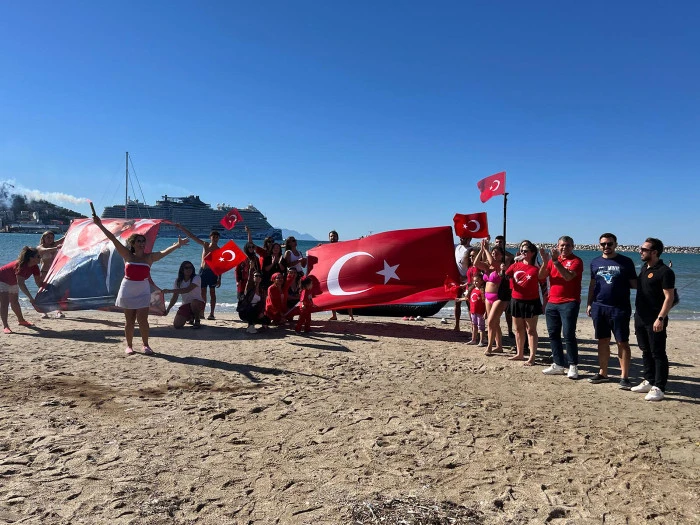 Etkinlik öncesinde denizde sörf tahtalarıyla açılan Atatürk ve Türk bayrakları, katılımcılara unutulmaz bir görsel şölen sundu.