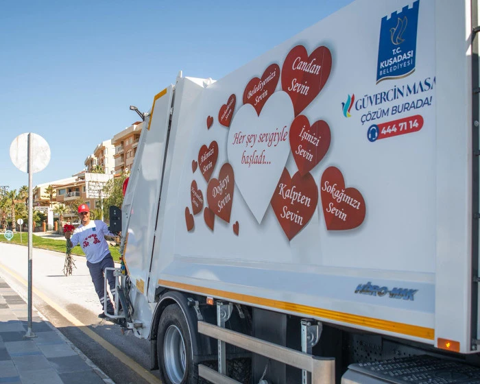 Kuşadası’nda bu yıl Sevgililer Günü, yalnızca çiftlerin değil tüm kentin yüzünü güldüren anlamlı bir sürprizle kutlandı. Kuşadası Belediyesi Temizlik İşleri Müdürlüğü ekipleri, sevgi temasıyla özel olarak hazırlanan çöp toplama aracıyla sokaklara çıkarak vatandaşlara karanfil dağıttı.