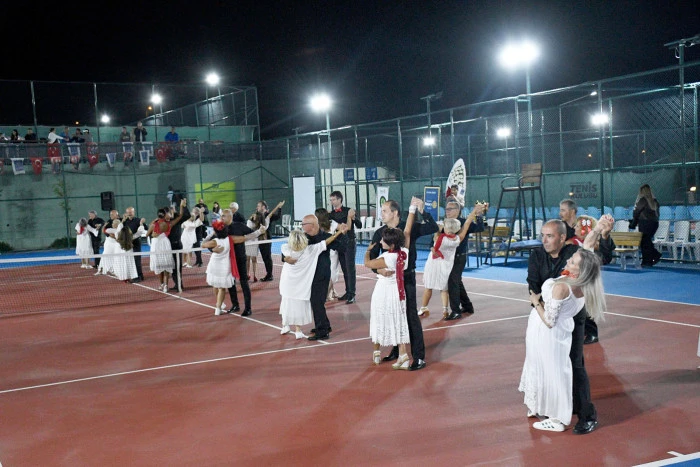 Gecede Kuşadası Kent Konseyi Cumhuriyet Sevdalıları Grubu, Atatürk’ün izinde hazırladıkları vals ve zeybek gösterileriyle sahne aldı. Cumhuriyet’in ruhunu en zarif biçimde yansıtan bu performans, izleyenlere unutulmaz anlar yaşattı. Ardından kortlara meşaleler eşliğinde çıkan tenisçiler, Cumhuriyet meşalesini simgeleyen görkemli bir kortej oluşturdu.