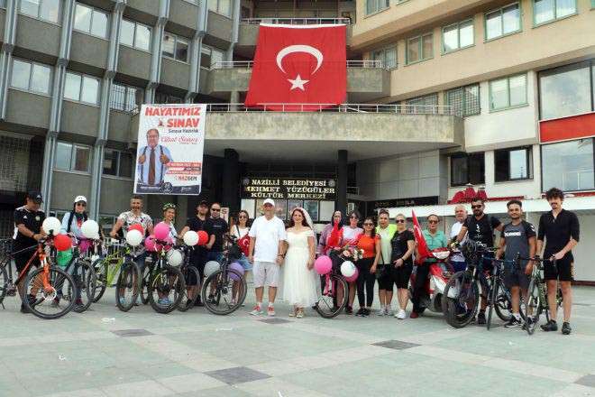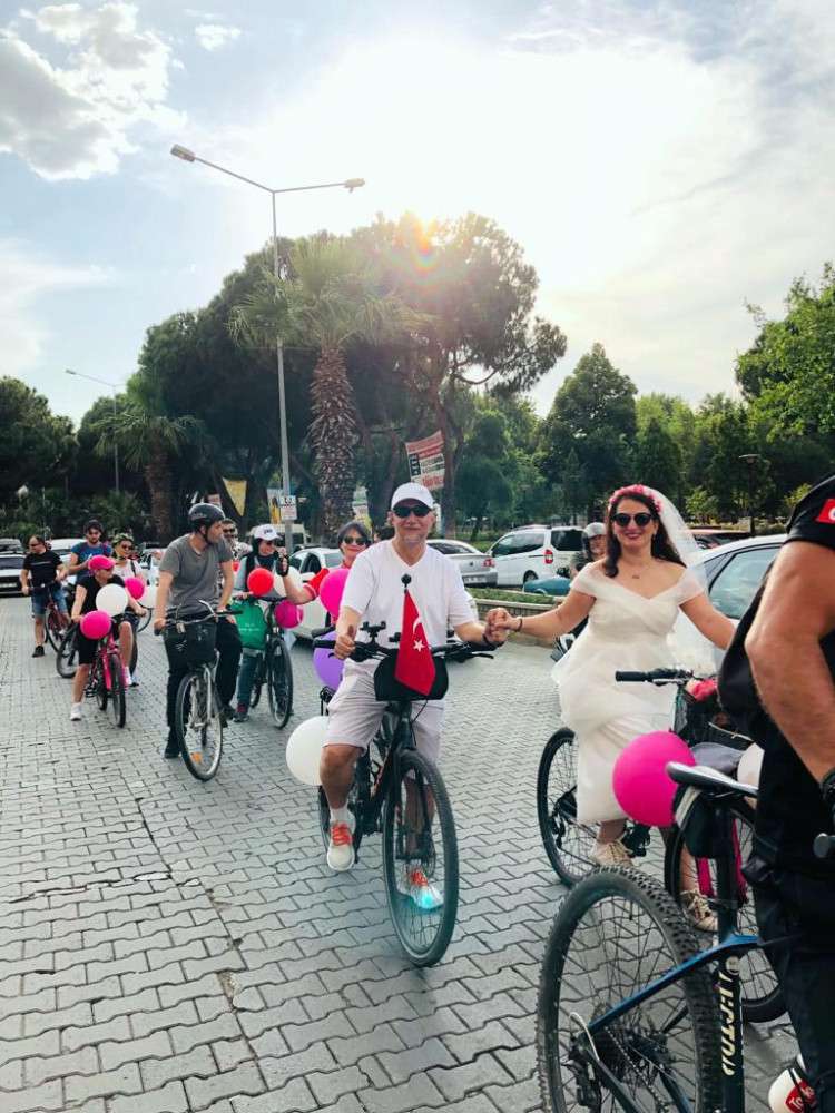 Nazilli Devlet Hastanesi’nde biomedikal olarak görev yapan Ayhan Tütüncü, “Biz birbirimizi bisikletle tanıdık. Bisiklet festivalinde tanıştık. Dedik ki bu aşkın temeli bisiklet, biz de düğünümüzde bisikletli konvoy yapalım. Bugün burada bu hayalimizi gerçekleştirdik. Buraya gelerek bize destek olan ve bizimle birlikte bisiklet turuna katılan tüm arkadaşlarımıza çok teşekkür ediyoruz” dedi.