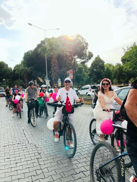 Nazilli’de yaşayan bisiklet tutkunu Funda Işık (47) ve Afyon Devlet Hastanesinden Nazilli Devlet Hastanesine atanan Biomedikal görevlisi Ayhan Tütüncü (56) evlilik kararı aldı. Birbirlerini bisiklet festivalinde tanıyan çift, düğünlerinden bir gün önce konvoy yapmaya karar verdi. Gelin arabası gibi süsledikleri bisikletleriyle şehir turuna çıkan çift, bisiklet tutkunu olan arkadaşlarıyla birlikte pedal çevirdi. Nazilli Belediye Meydanı’ndan başlayan bisikletli konvoy turu, Dallıca’ya kadar devam etti. Dikkat çeken bisiklet konvoyunda gelin ve damadı gören vatandaşlar şaşkınlıklarını gizleyemedi. Alkışlarıyla destekte bulunan vatandaşlar, çifte mutluluklar diledi. Bu akşam Lidya Life Kır Düğün Bahçesi’nde dünya evine girecek olan Funda Işık ve Ayhan Tütüncü, arkadaşlarıyla hatıra fotoğrafı çekildikten sonra herkesi düğünlerine davet etti.