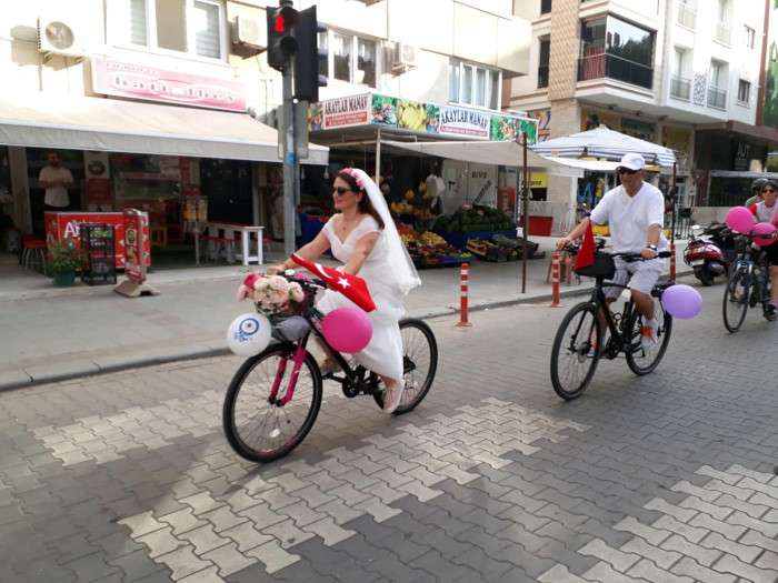 Nazilli'de bisiklet tutkunu çift, gelin arabası gibi süsledikleri bisikletleriyle konvoy yaptı. Bisikletli gelin ve damat arkadaşlarıyla birlikte şehir turu atarken, gördükleri karşısında şaşkınlıklarını gizleyemeyen vatandaşlar bir yandan alkışlar eşliğinde mutlu çifti selamladı diğer yandan o anları cep telefonları ile kaydederek ölümsüzleştirdi.