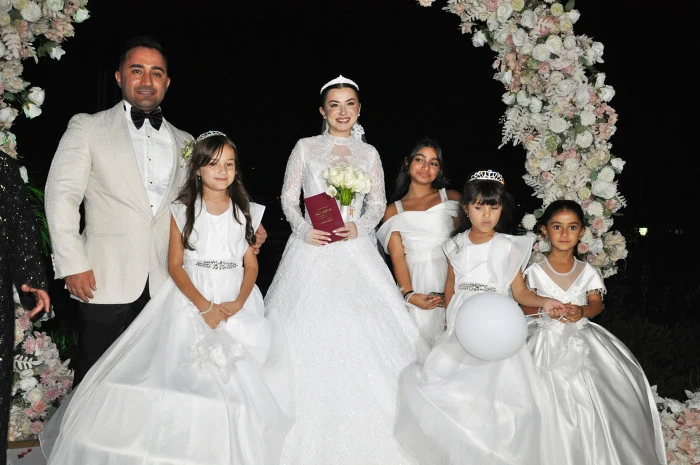 . Küçük nedimelerinin ve Müzik eşliğinde alkışlarla alana giriş yapan Esra ve Sercan çifti, nikâh defterini imzalayarak birlikteliklerini taçlandırdı.