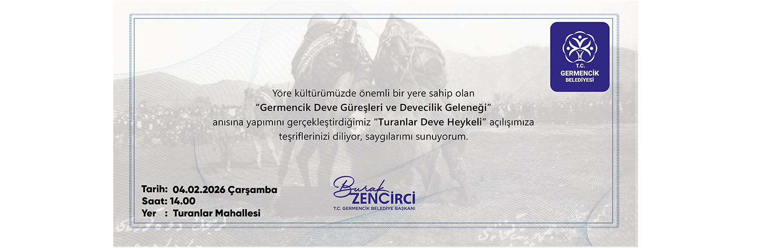 Yöre kültürümüzde önemli bir yere sahip olan “ Germencik Deve Güreşleri ve Devecilik Geleneği” anısına yapımını gerçekleştirdiğimiz “Turanlar Deve Heykeli” açılışımıza teşriflerinizi diliyor, saygılarımızı sunuyoruz.