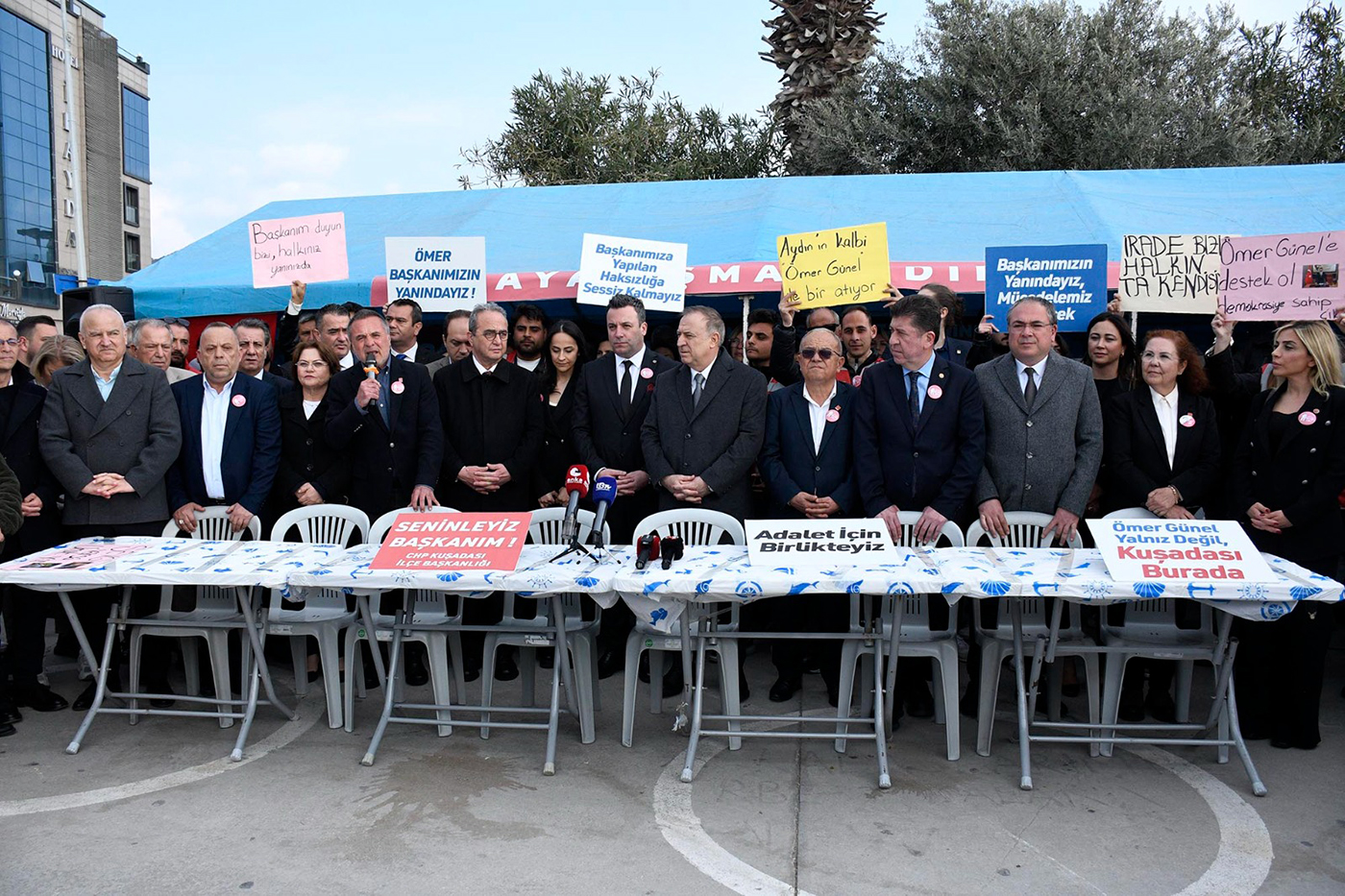 Başkan Vekili;“Önemle belirtmek gerekir ki burada belediye başkanı seçmedik. Kuşadası’nın seçilmiş belediye başkanı hâlâ Ömer Günel’dir. Halkın oylarıyla seçilmiş başkanımız, hukuktan yoksun iddialarla Silivri’de tutulmaktadır.
