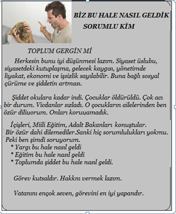 İktidara bakıyorum, milletin haline bakıyorum, olanlara bakıyorum bir vatandaş olarak hayretler içinde kalıyorum. Şiddet ve uyuşturucu toplumun her kesimine girmiş. Şiddet ortaokul öğrencilerine kadar inmiş. Uyuşturucu yaşı 12 olmuş. Okullarda disiplin kaybolmuş, öğretmenin etkisi azalmış. Ailelerin çocuklara sözü geçmiyor. Bu çocuklar bu hale nasıl geldi. Etkili olan faktörler neler olduğuna baktığımızda;