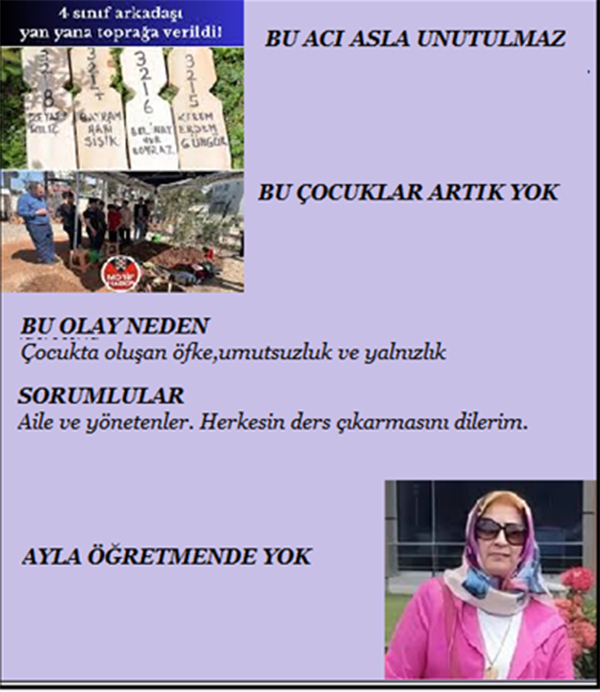 Evet ne yazık ki bu acı olaylar yaşandı. Nedenler belli. Bu nedenleri iyi anlamalıyız. Ona göre çözümler üretmeliyiz. En önemlisi çocuklara gerçek hayatı öğreten eğitim sistemi esas alınmalı. Aileleriyle iletişimleri güçlendirilmeli. Sevgi ortamı içinde birbirlerini sevmelerini sağlamalıyız. Ahlakın ve vicdanın önemini onlara vermeliyiz.